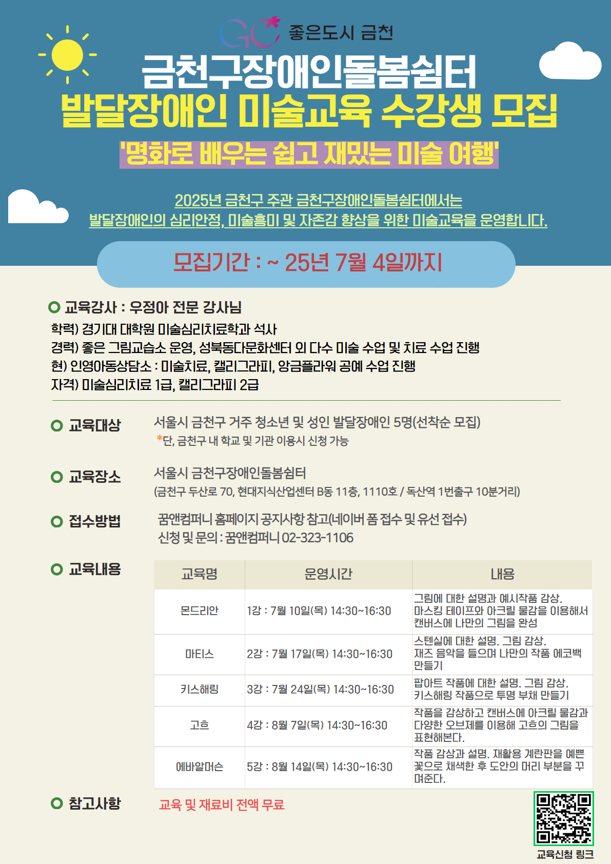 안녕하세요 서울시 금천구에서는 청소년 및 성인 발달장애인의 미술흥미찾기, 심리안정 및 자존감향상을 위한 미술교육 참여자를 모집하고 있습니다.