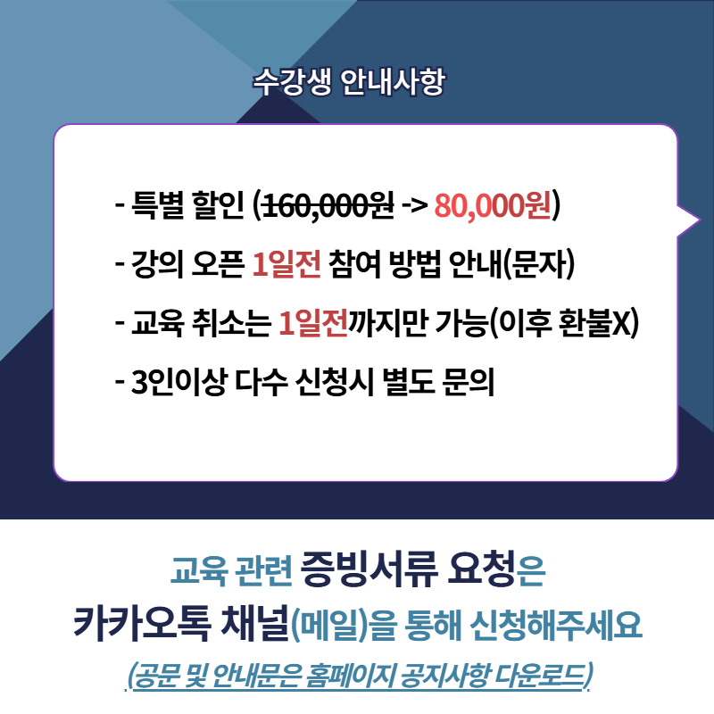 환불을 요청할 경우 교육 1일전까지 100%환불이 가능합니다.